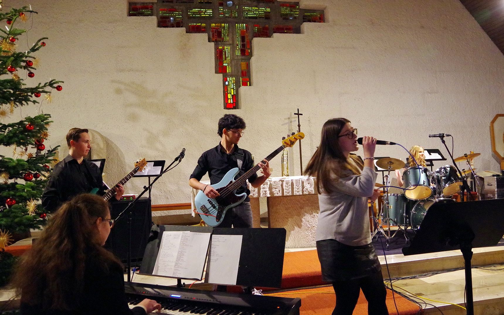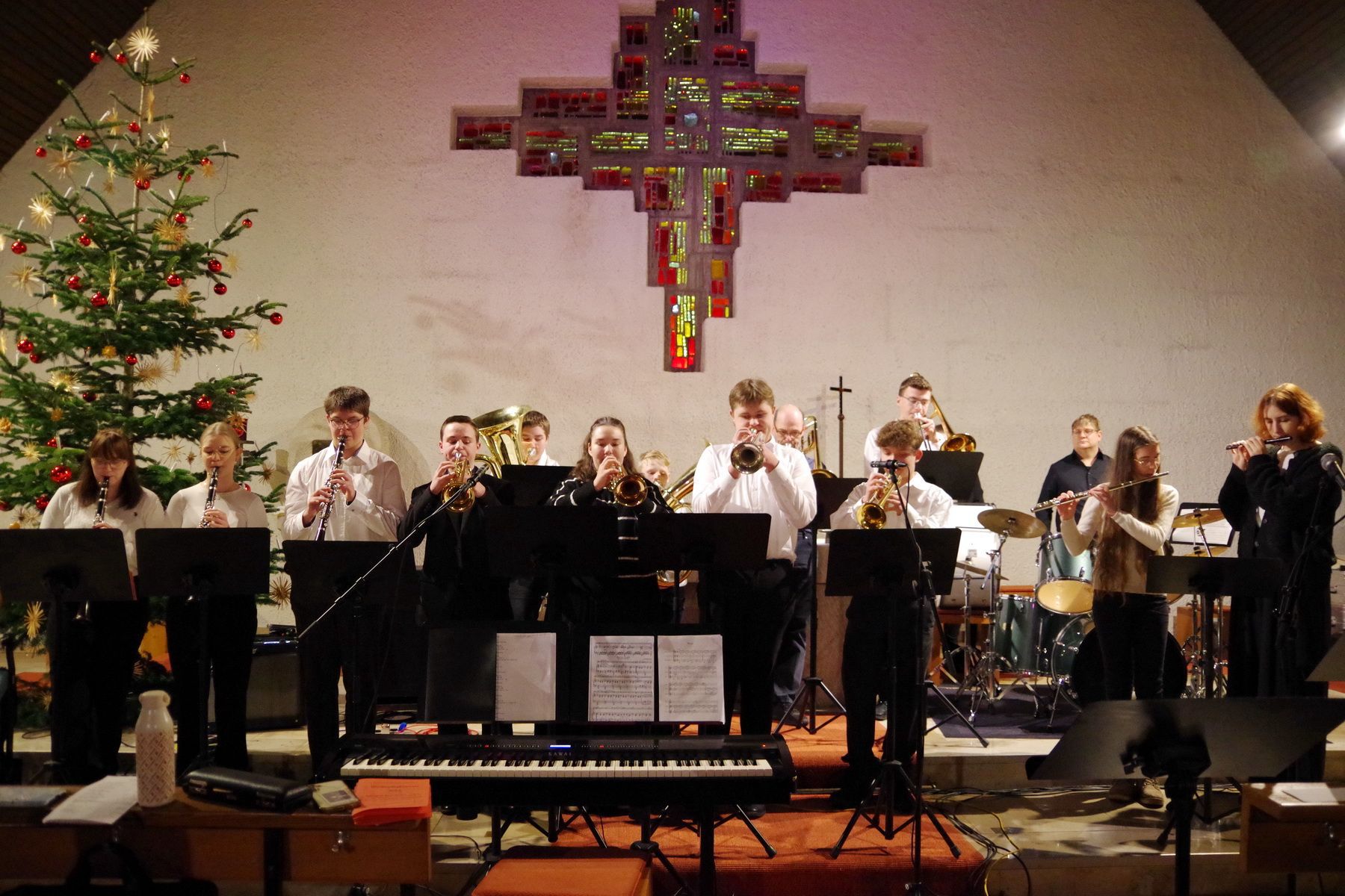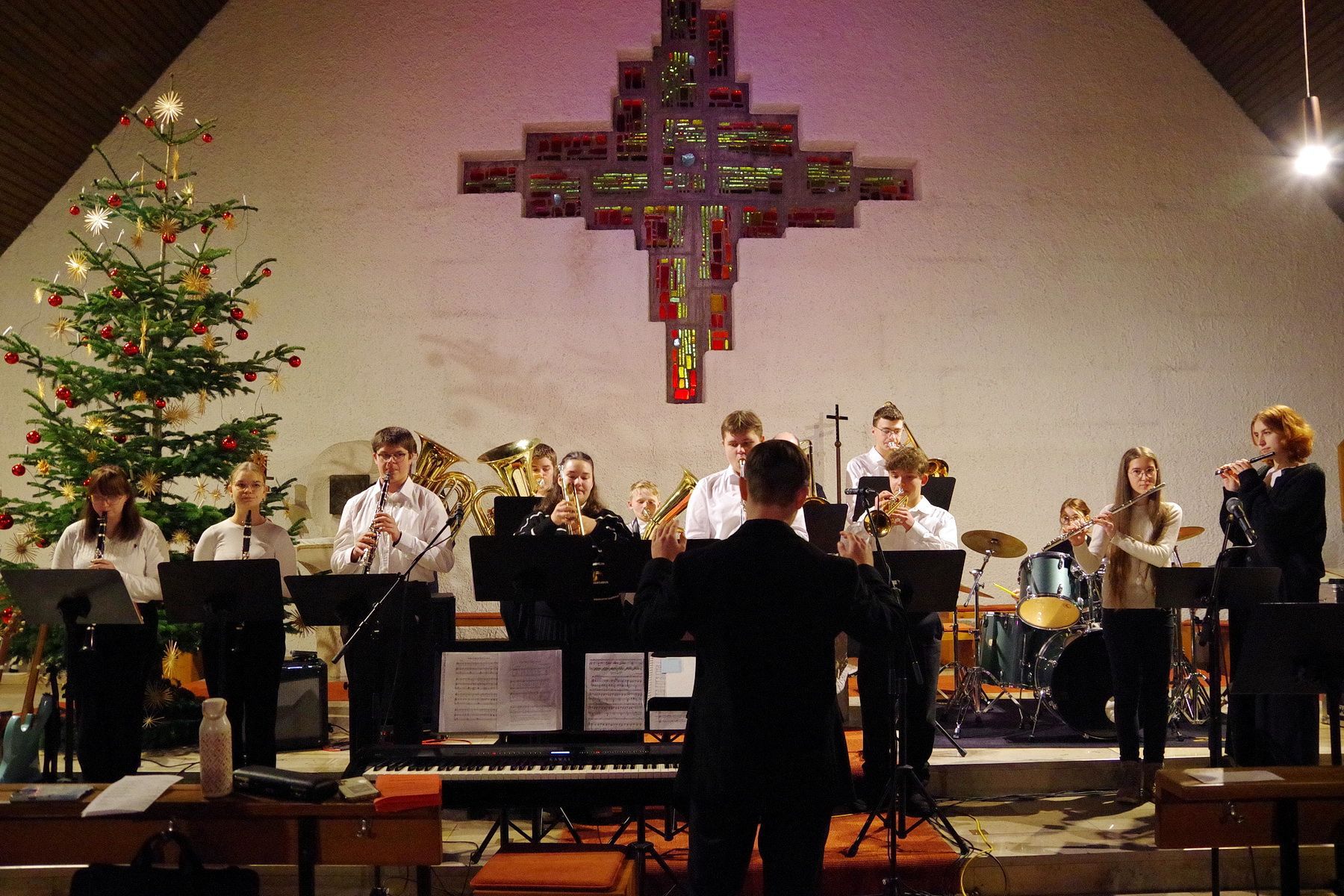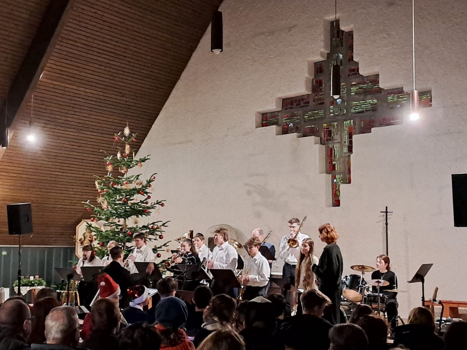 Für mitreißende Stimmung sorgte die energiegeladene Performance der Schulband. Mit „Where are you Christmas!“ und den „Maroon 5“-Klassiker „This Love“ sowie Power-Zugaben riss die Band mit ihrer tollen Sängerin Mia Steube und deren ebenso kraft- wie gefühlvollen Stimme das Publikum nicht nur sprichwörtlich von den Stühlen – anzunehmen, dass derart rockige Musik nicht allzu oft das Kirchenschiff der Heilig Kreuz-Kirche erbeben lässt. Innig-ergreifend das von allen Mitwirkenden des Abends gemeinsam angestimmte „Do they know it´s Christmas?“, bevor auch alle Besucherinnen und Besucher beim bereits über 400 Jahre alten, vielleicht bekanntesten Adventslied „Macht hoch die Tür, die Tor macht weit“ mitsangen und ihre Stimmen mit den Bläserklängen verschmolzen.