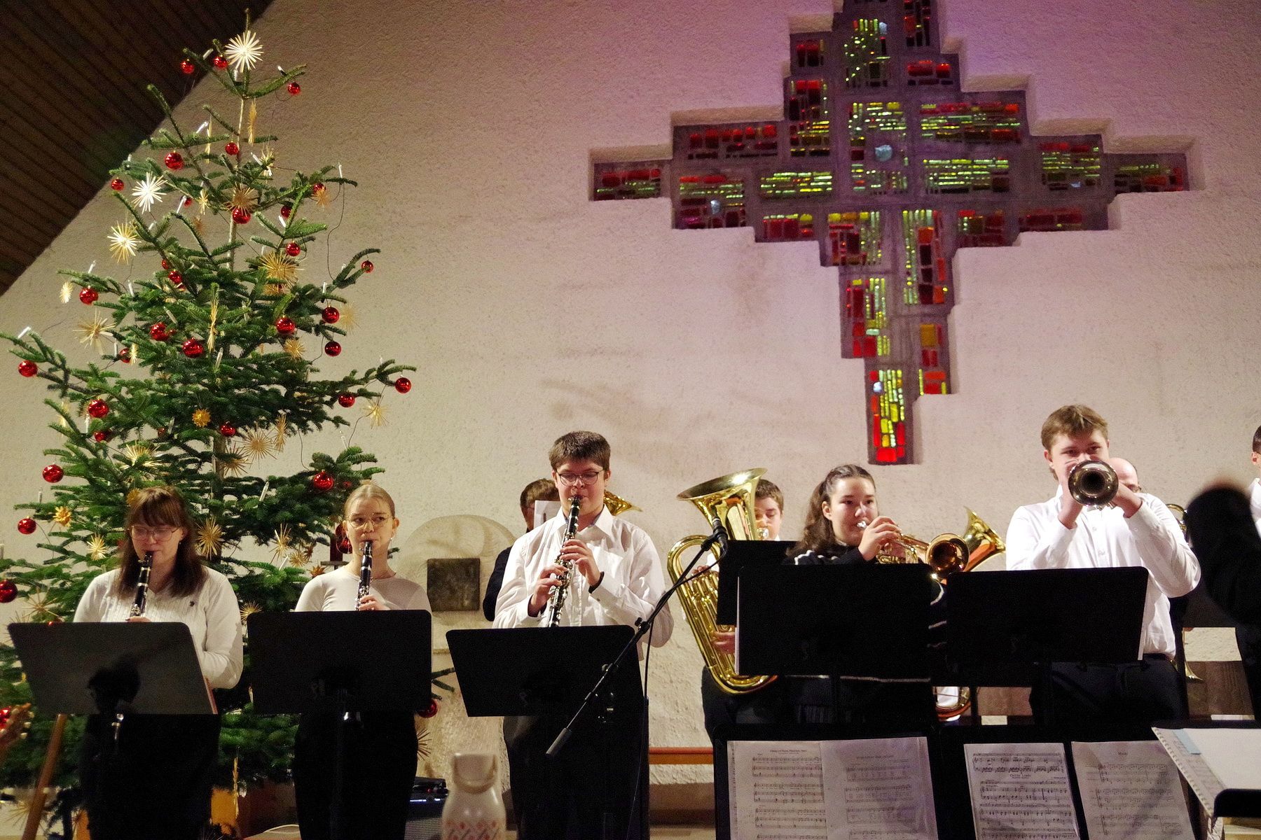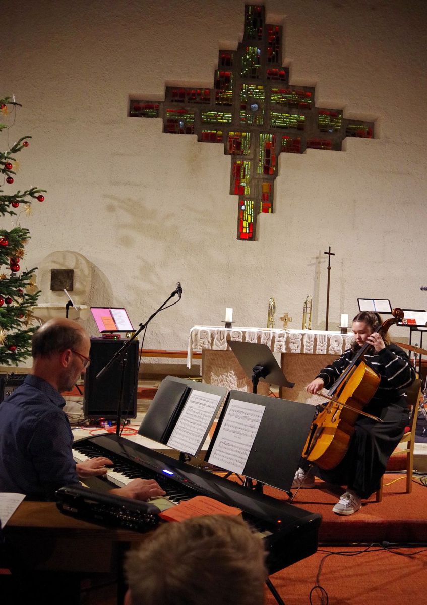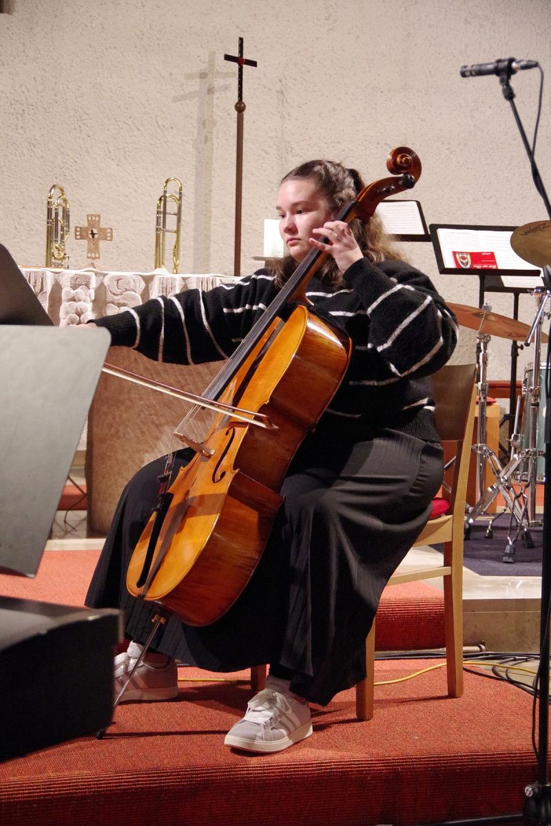 Für mitreißende Stimmung sorgte die energiegeladene Performance der Schulband. Mit „Where are you Christmas!“ und den „Maroon 5“-Klassiker „This Love“ sowie Power-Zugaben riss die Band mit ihrer tollen Sängerin Mia Steube und deren ebenso kraft- wie gefühlvollen Stimme das Publikum nicht nur sprichwörtlich von den Stühlen – anzunehmen, dass derart rockige Musik nicht allzu oft das Kirchenschiff der Heilig Kreuz-Kirche erbeben lässt. Innig-ergreifend das von allen Mitwirkenden des Abends gemeinsam angestimmte „Do they know it´s Christmas?“, bevor auch alle Besucherinnen und Besucher beim bereits über 400 Jahre alten, vielleicht bekanntesten Adventslied „Macht hoch die Tür, die Tor macht weit“ mitsangen und ihre Stimmen mit den Bläserklängen verschmolzen.