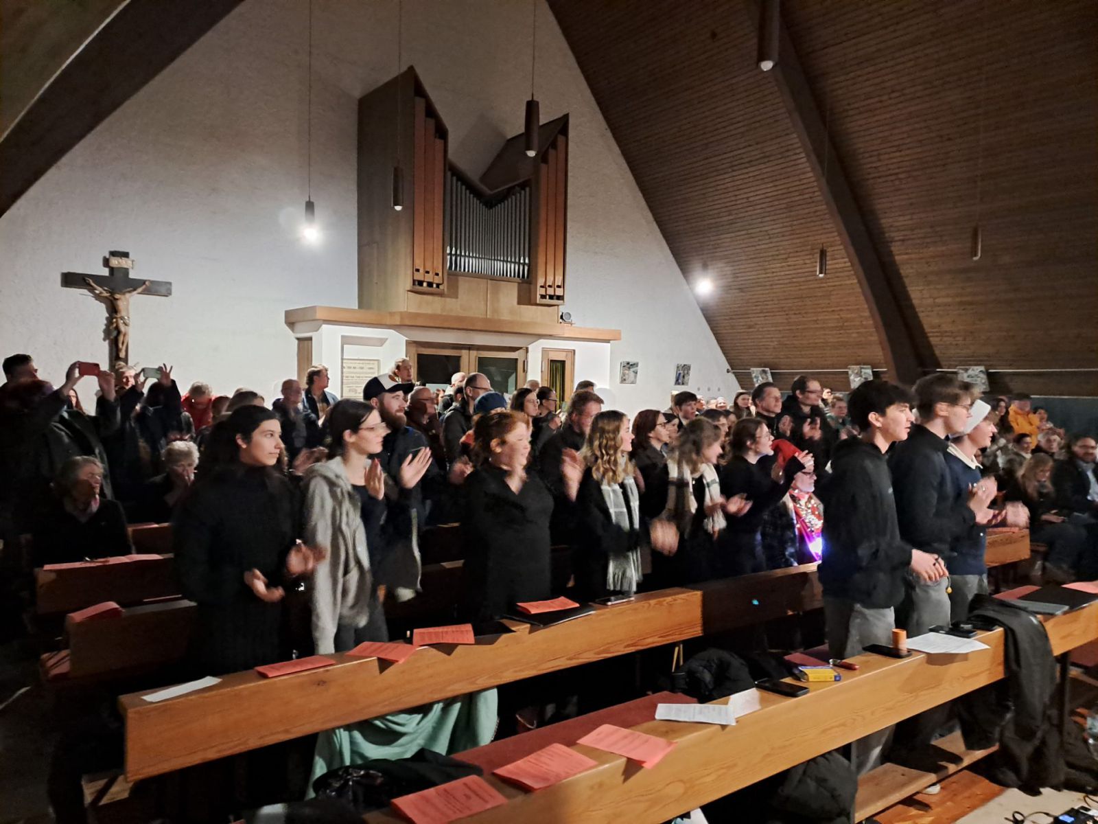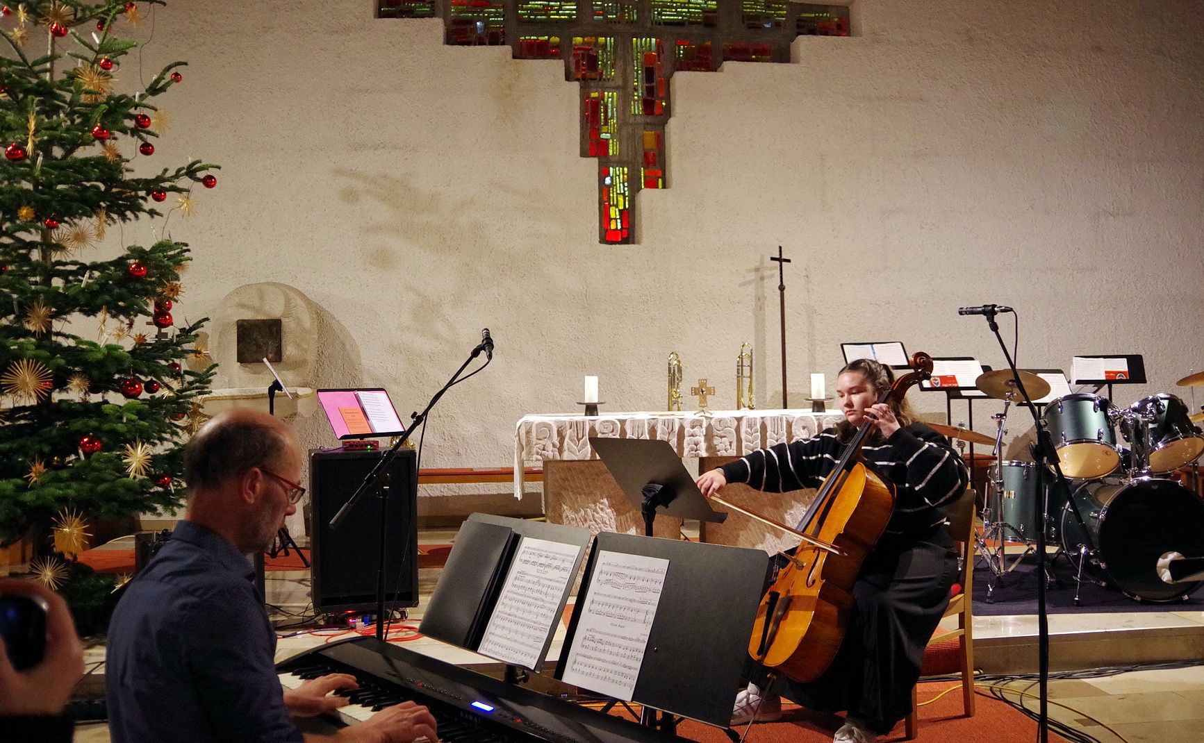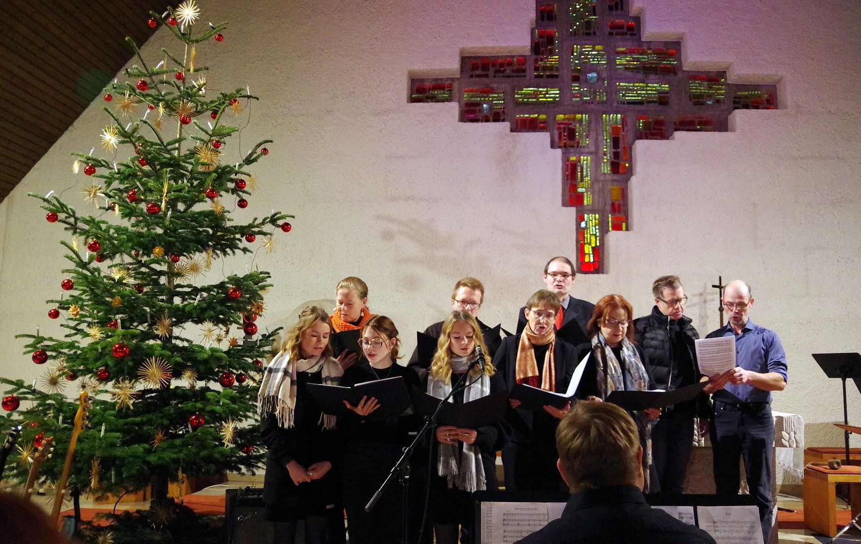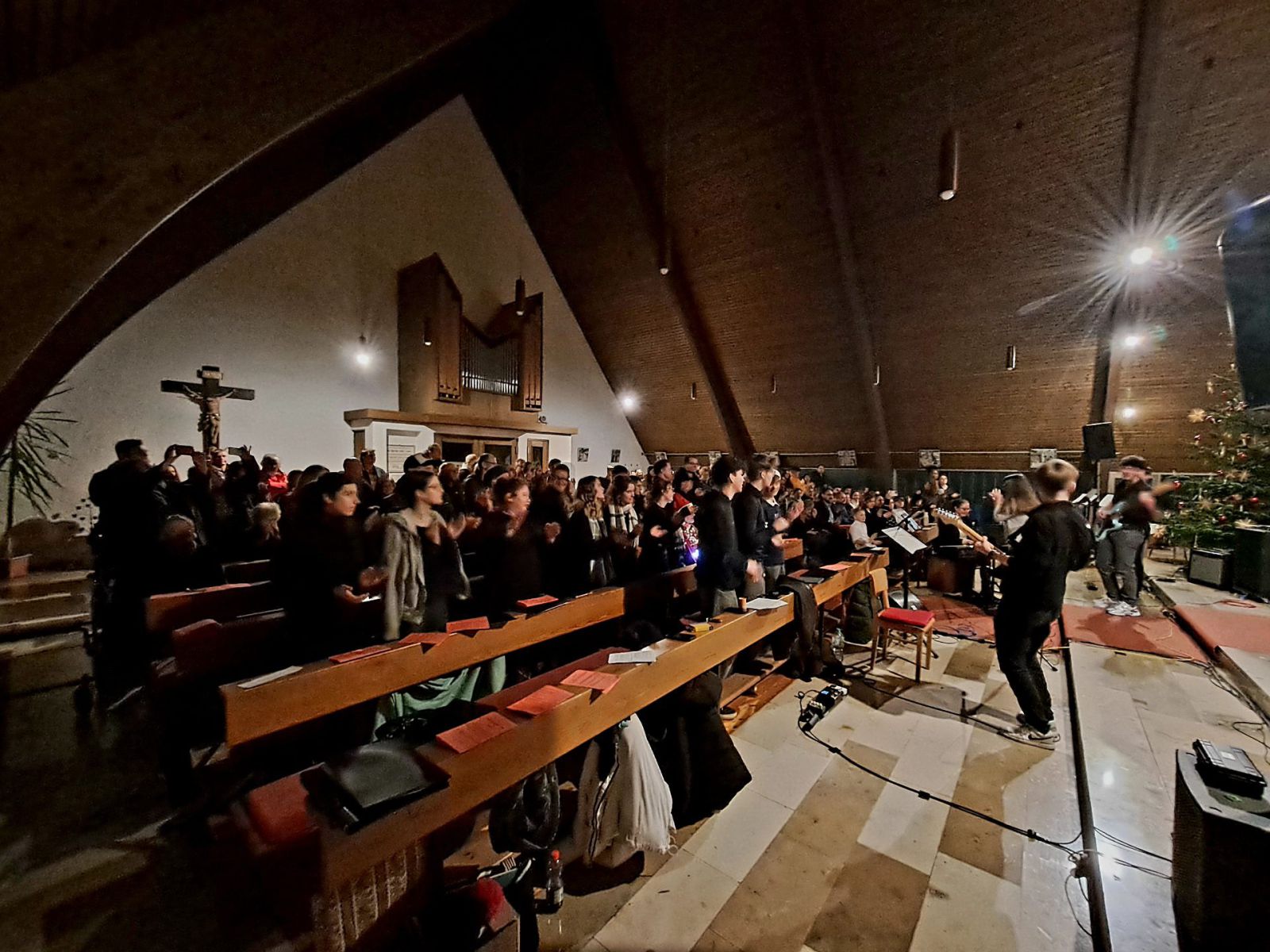 Für mitreißende Stimmung sorgte die energiegeladene Performance der Schulband. Mit „Where are you Christmas!“ und den „Maroon 5“-Klassiker „This Love“ sowie Power-Zugaben riss die Band mit ihrer tollen Sängerin Mia Steube und deren ebenso kraft- wie gefühlvollen Stimme das Publikum nicht nur sprichwörtlich von den Stühlen – anzunehmen, dass derart rockige Musik nicht allzu oft das Kirchenschiff der Heilig Kreuz-Kirche erbeben lässt. Innig-ergreifend das von allen Mitwirkenden des Abends gemeinsam angestimmte „Do they know it´s Christmas?“, bevor auch alle Besucherinnen und Besucher beim bereits über 400 Jahre alten, vielleicht bekanntesten Adventslied „Macht hoch die Tür, die Tor macht weit“ mitsangen und ihre Stimmen mit den Bläserklängen verschmolzen.