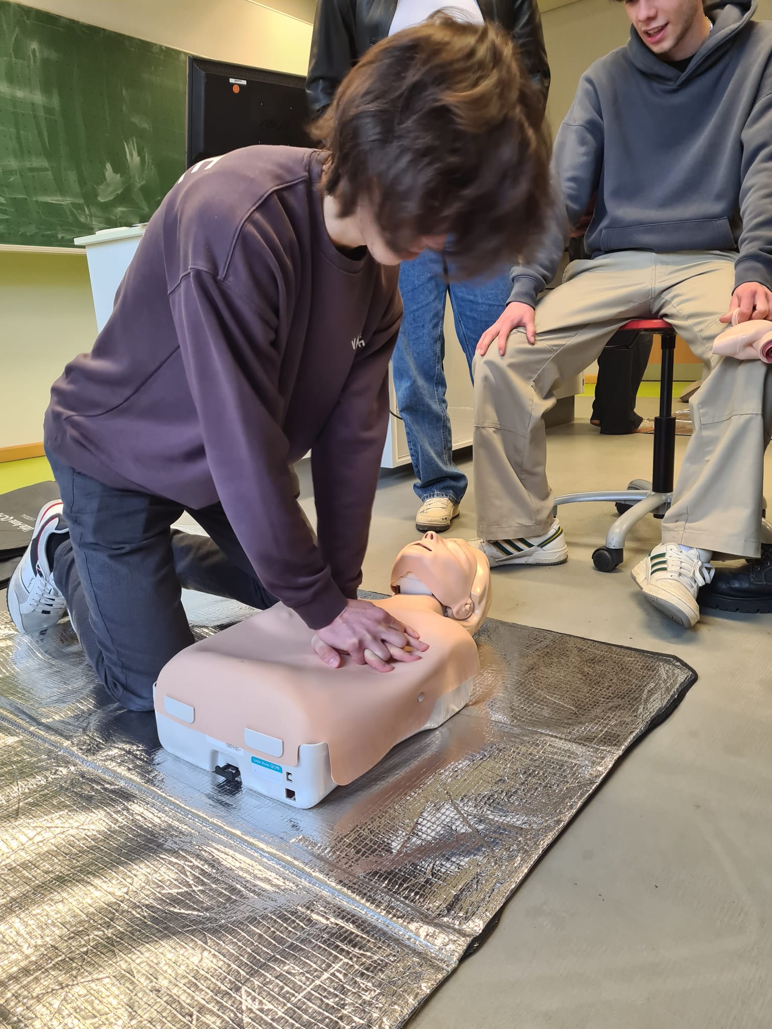 Das bundesweit etablierte Herzensretter-Konzept vermittelt Wiederbelebung in drei aufeinander aufbauenden Stufen: Bronze (Herzdruckmassage), Silber (Herzdruckmassage und Beatmung) und Gold, die höchste Ausbildungsstufe des Programms. Im Gold-Modul lernen die Teilnehmenden neben den Basismaßnahmen auch den sicheren Umgang mit dem automatisierten externen Defibrillator (AED) – einem Gerät, das im Ernstfall entscheidend sein kann. Auch wir haben einen AED in der Turnhalle!