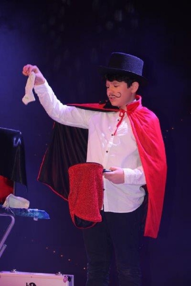 Und dann war es so weit: Sirini hatte seinen großen Auftritt. Mit rotem Zauberumhang und schwarzem Zylinder betrat Sirini die Bühne unter musikalischer Begleitung des Kronacher Jugendorchesters. „Ich möchte euch heute für ein paar Minuten in die Welt der Magie entführen“, begrüßte Sirini das Publikum und legte auch gleich los.